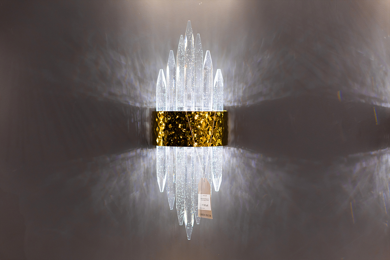Стильное бра со стеклянным плафоном в виде продолговатых кристаллов воплощает в себе простую элегантность стекла и роскошь позолоченного металла. Красивое бра в интерьере смотрится невероятно роскошно – мягкий рассеянный свет и оригинальный дизайн ненавязчиво украшают пространство. Можно установить бра над кроватью в спальне, возле зеркал и картин в прихожей или коридоре. Этому дизайнерскому светильнику везде найдется место. Эффектное бра в гостиной создаст интимную атмосферу при выключенной люстре и выделит любой декор, размещенный на стене. Модель также представлена в цвете хром.