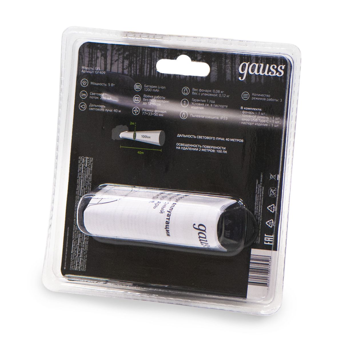Купить "Налобный светодиодный фонарь Gauss аккумуляторный 77х50 200 лм GF409"