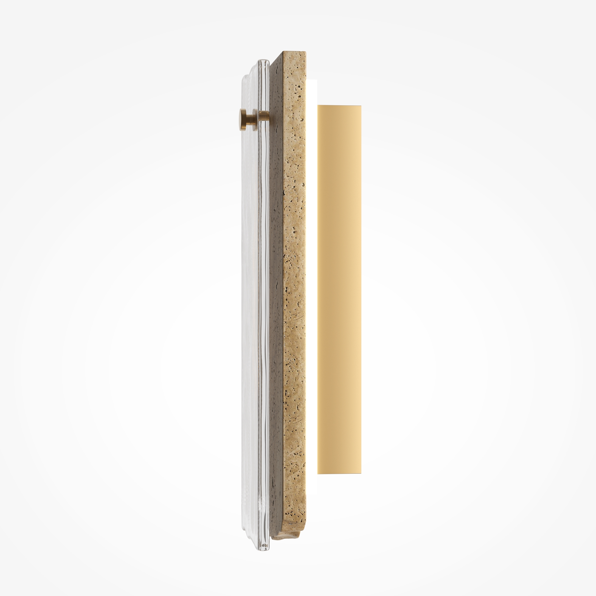 Характерный для серии контраст фактур: пористый травертин бежевого оттенка, металл цвета крашеной латуни и глянцевое стекло с «мятым» волнообразным паттерном. LED-источник (3000К) по контуру создаёт ореол на стене и подсвечивает стекло изнутри. Крафтовая обработка с неидеальными краями и лёгкой асимметрией придаёт каждому изделию эффект рукотворной эксклюзивности. Универсальны для современных жилых и коммерческих интерьеров. Эффектны как одиночный акцент и в композициях.