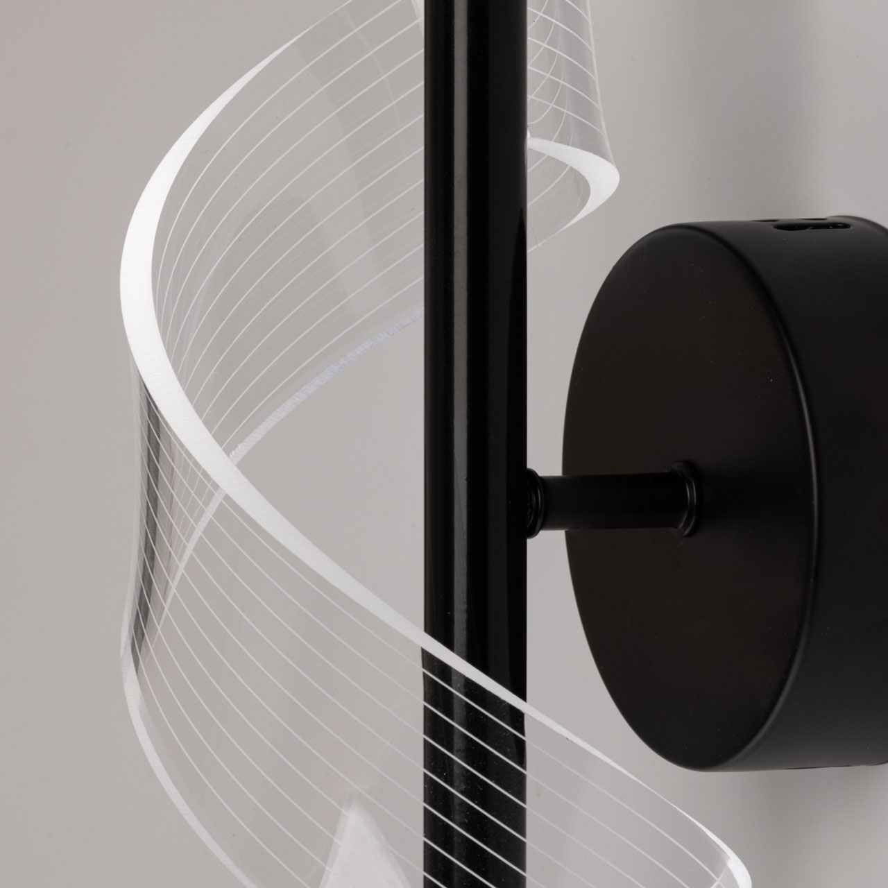 Черный цвет основания настенного бра привлекает к себе внимание и эффектно выделяет вертикальное бра на стене. Оригинальный плафон из прозрачного акрила в виде закрученной ленты делает настенное бра арт объектом. Многорежимность с изменением цветовой температуры от 3000К до 6500К является элементом светодизайна и позволяет подобрать комфортную температуру света. Качественные светодиоды и корпус из сплава алюминия обеспечивают яркое освещение и долгий срок службы. Светодиодные источники света экономичны и безопасны.