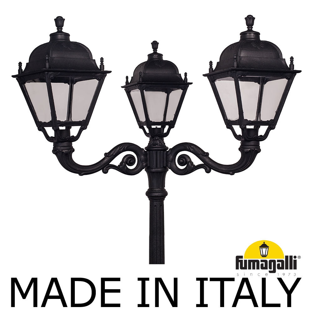 Парковый фонарь FUMAGALLI большого размера серии SIMON, модель HOREB ADAM/SIMON 3L. Парковый фонарь с 3 светильниками большого размера, на консолях ADAM большого размера, установленных на классическом столбе HOREB высотой 3,5 м (+высота фонарей на кронштейнах). Изготовлены в Италии, по уникальным технологиям "FUMATECH" из современного композитного полимера RESIN. Этот материал в 5 раз прочнее металла, не ржавеет, не окисляется, не выгорает на солнце, его не нужно красить. Все светильники пыле-влаго защищены по стандарту IP55 (Пылезащищенные, защита от водяных струй с любого направления). Рассеиватель выполнен из антивандального, не мутнеющего и не горючего PMMA (ПолиМетилМетаАкрилат). Срок службы светильника - не менее 20 лет. Температура использования от -60 до +90. В серии SIMON есть садовые фонари в настенном (OFIR/SIMON, MIRRA/SIMON) подвесном (SICHEM/SIMON) и наземном исполнении (IAFAET.R/SIMON, ALOE.R/SIMON, ARTU/SIMON, GIGI/SIMON, RICU/SIMON, NEBO/OFIR/SIMON 1L, NEBO/OFIR/SIMON 2L, TABOR/ADAM/SIMON 3L) со столбами разной высоты, с разным количеством и конфигурацией голов. Консоли настенных фонарей и кронштейны светильников на столбах освещения могут устанавливаться в положение вверх и вниз. Столбы выше 150 см имеют в основе мощную стальную трубу с двойной оцинковкой. При заказе требуется выбрать цвет корпуса, цвет плафона и тип патрона (Е-27 или LED GX-53). Возможен светодиодный вариант. По стилю и дизайну серия уличных светильников SIMON похожа на светильники среднего размера серии CEFA. По размеру относится к большим парковым светильникам как серия NOEMI и GLOBE 400.