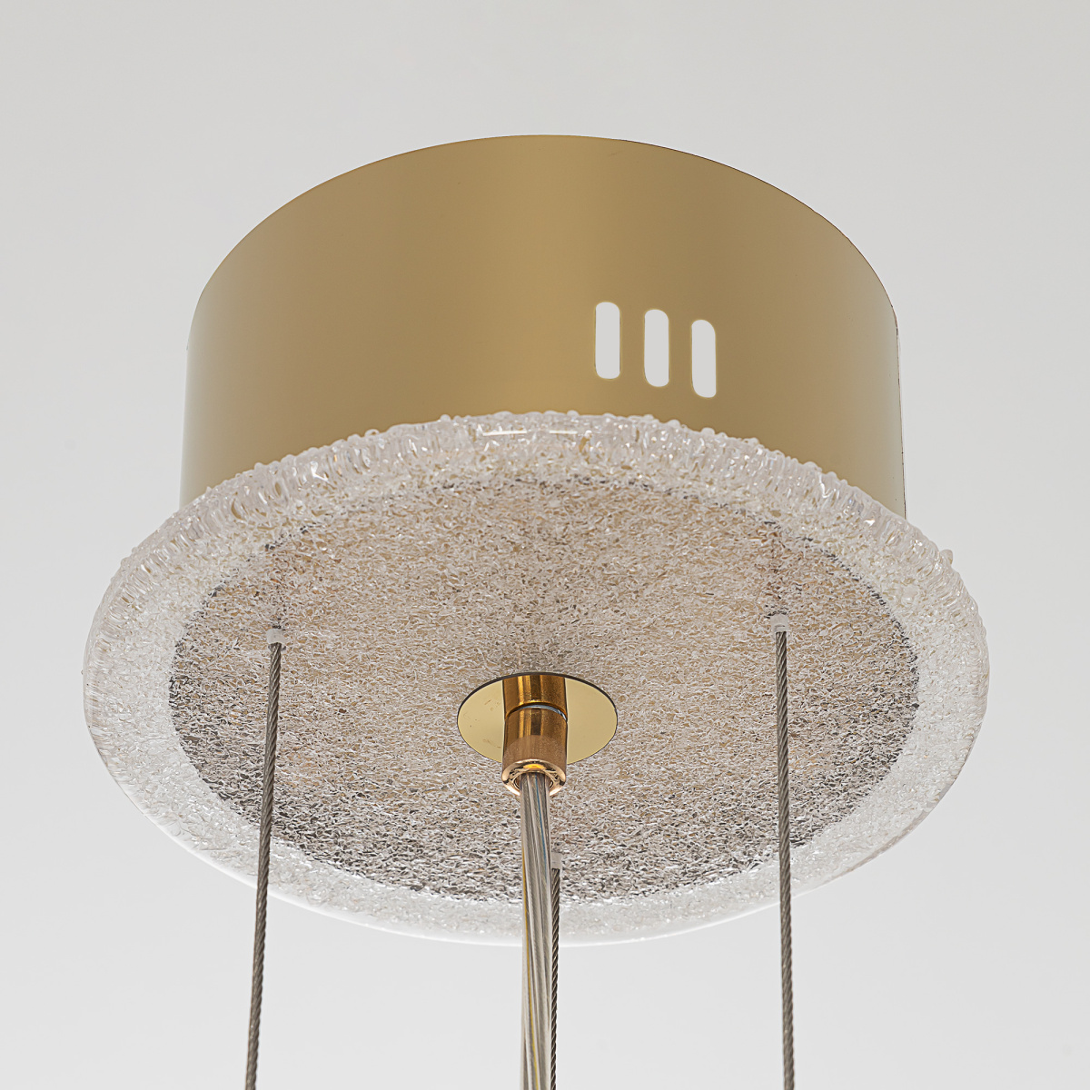 Люстру можно смонтировать даже на натяжной потолок, а также установить в комнате с невысокими потолками, поскольку высота подвесов регулируется.