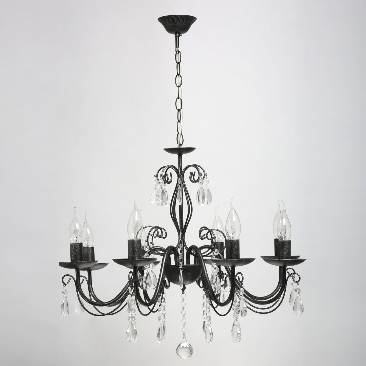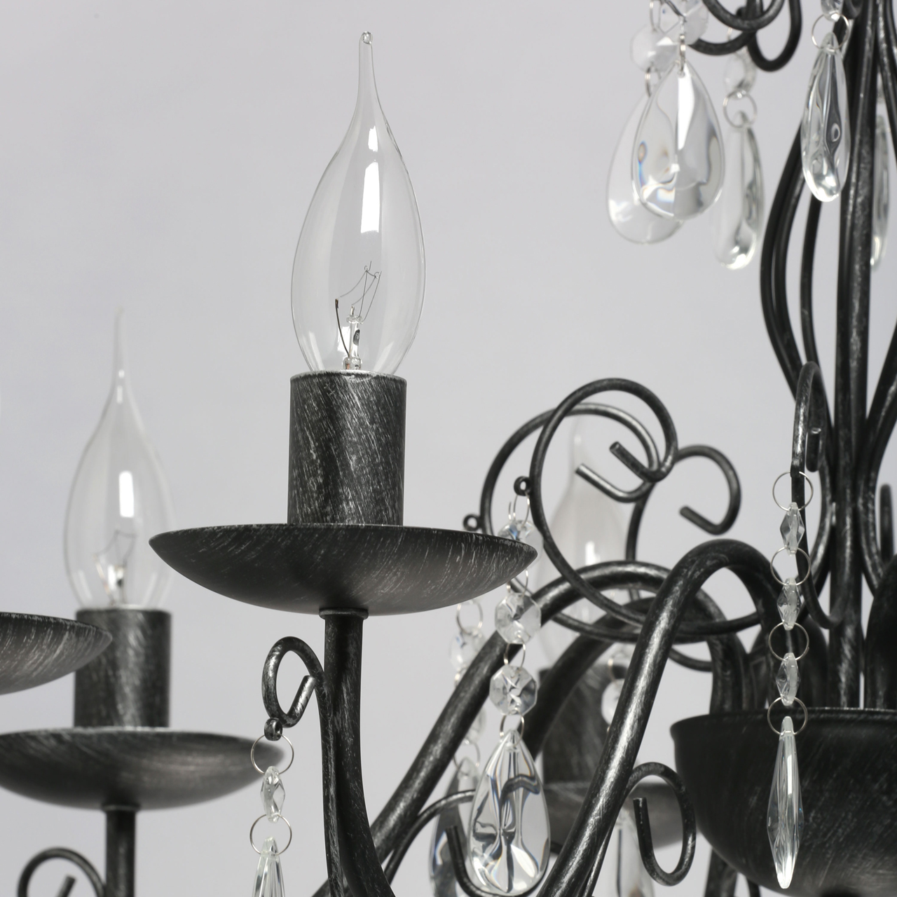 Основание светильника выполнено из металла и обработано по технологии хай-лайт, где основной слой черного цвета, а декоративный слой серебряного цвета. Светильник декорирован прозрачным хрусталем.