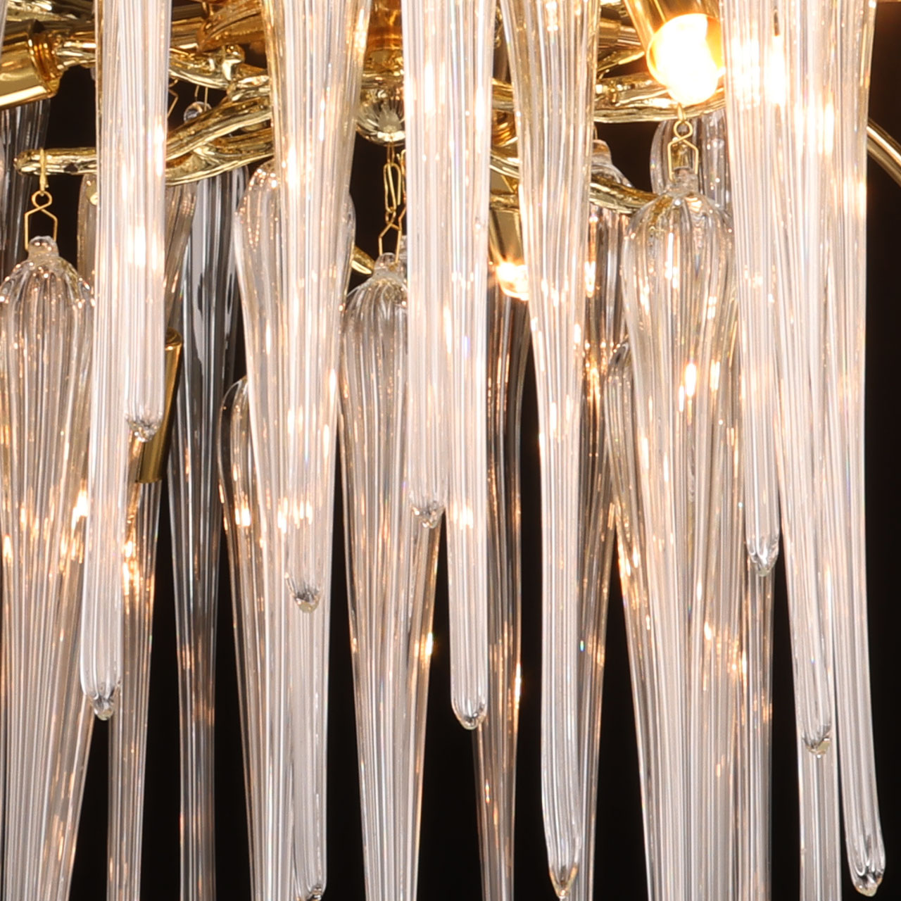 Основание подвесной люстры выполнено по технологии художественного литья из сплава алюминия с цинком и гальванизировано в цвет золота. Люстра декорирована прозрачным стеклом вытянутой формы.