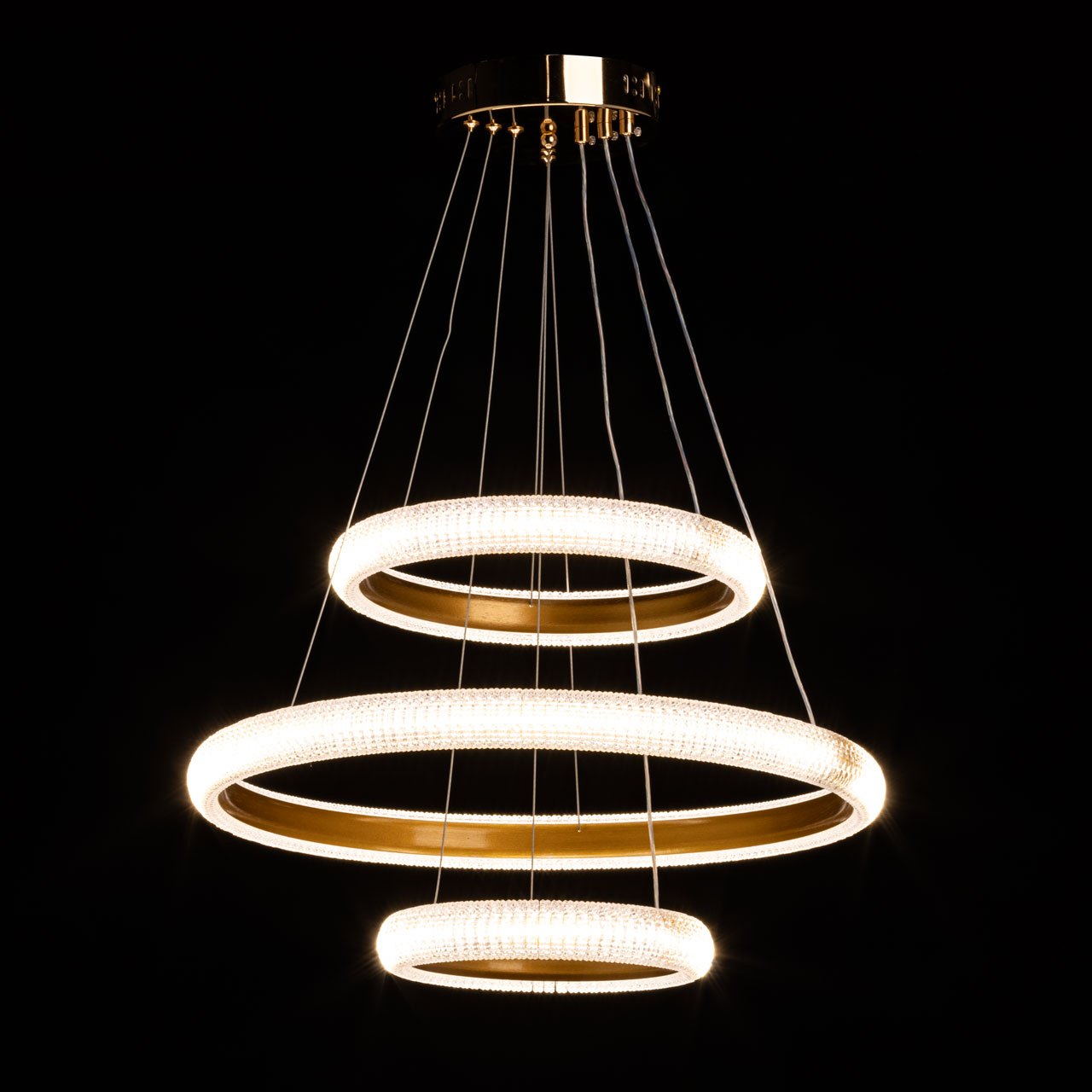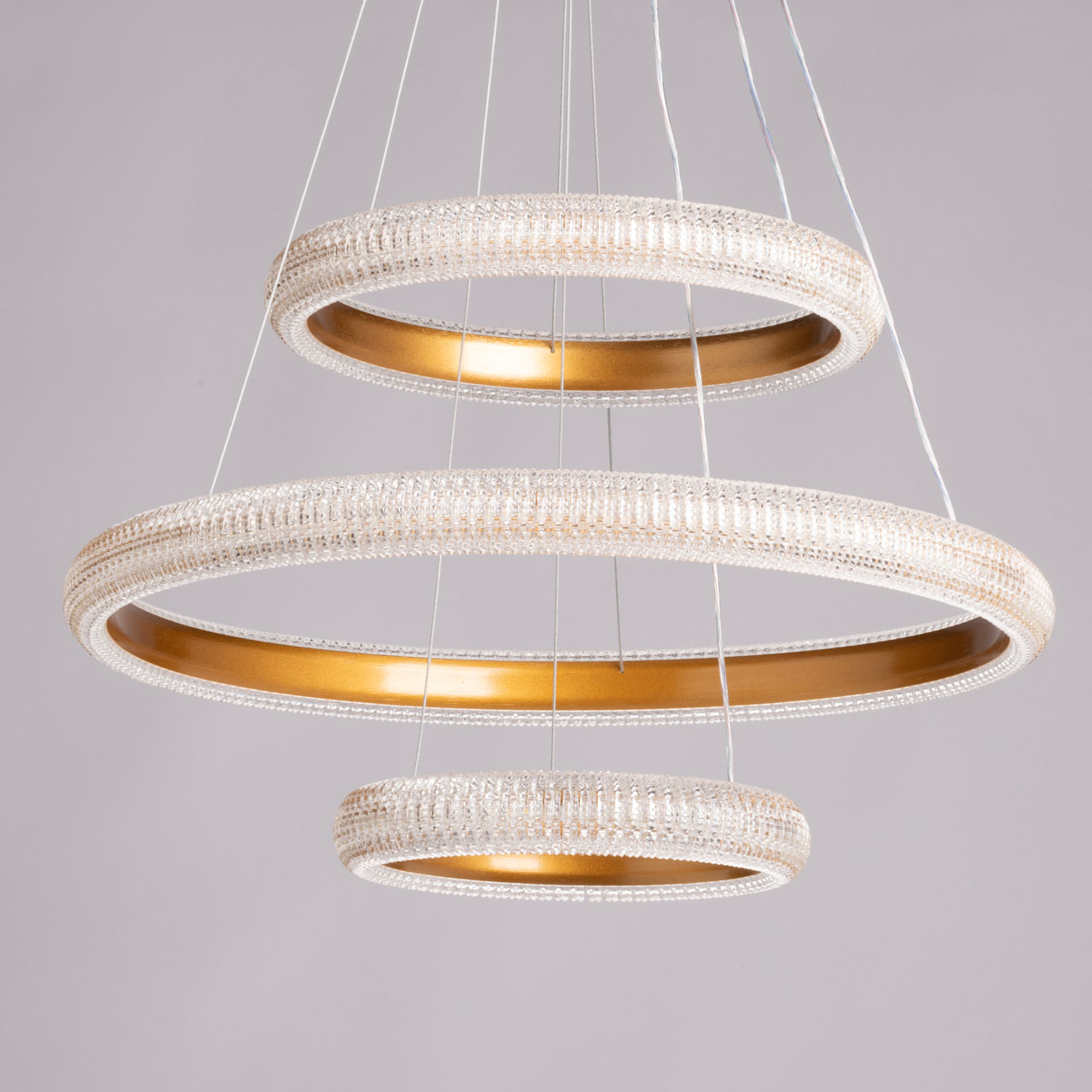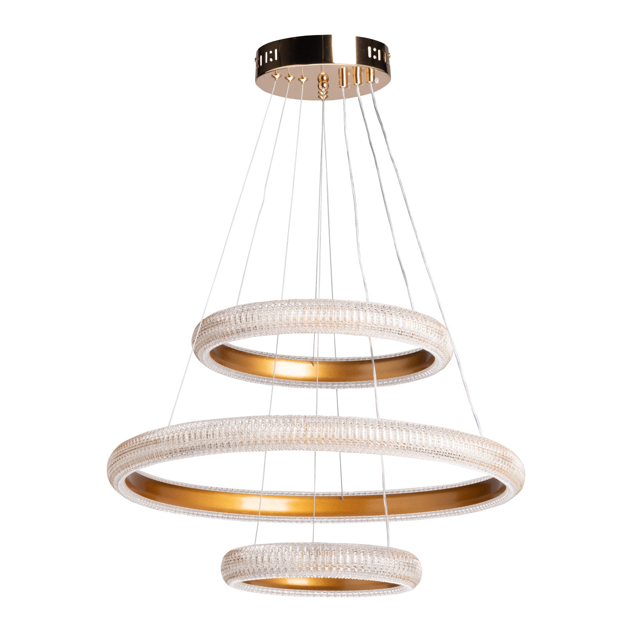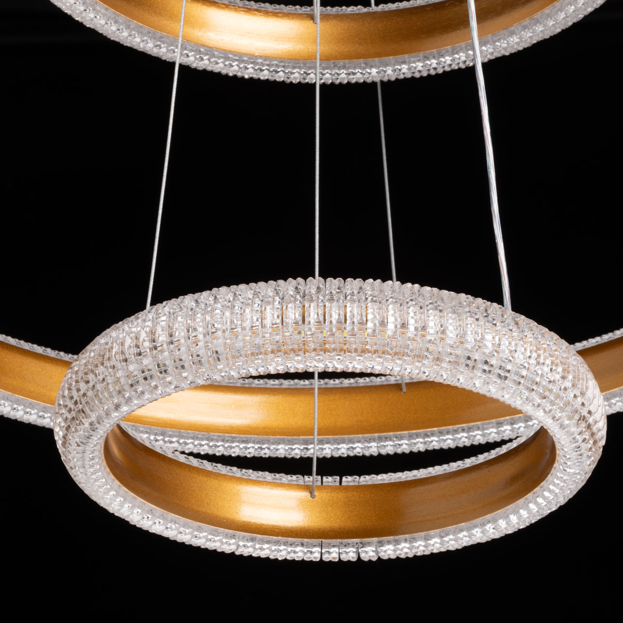 Металлическое основание светильника гальванизировано в цвет золота. Корпус плафона выполнен из сплава алюминия с цинком и обработан по технологии порошкового окрашивания в цвет матового золота. Светодиодные источники света закрыты прозрачным фактурным акрилом.
