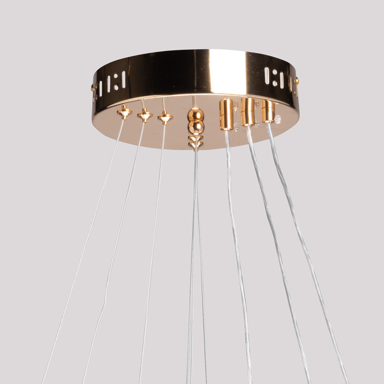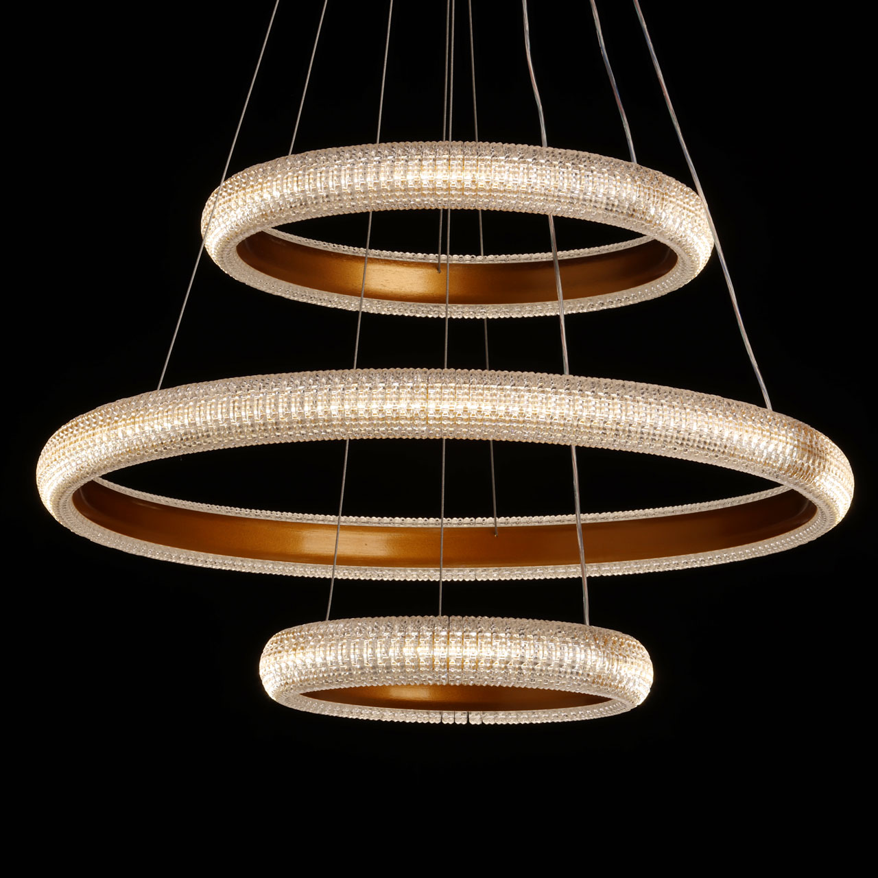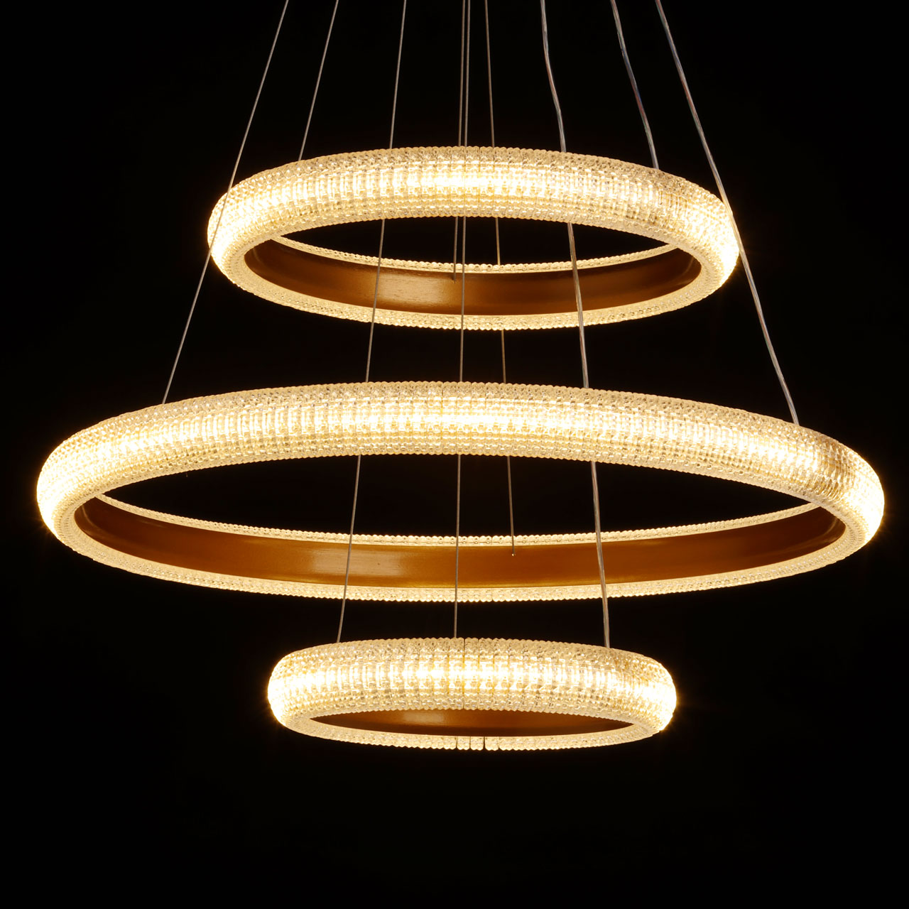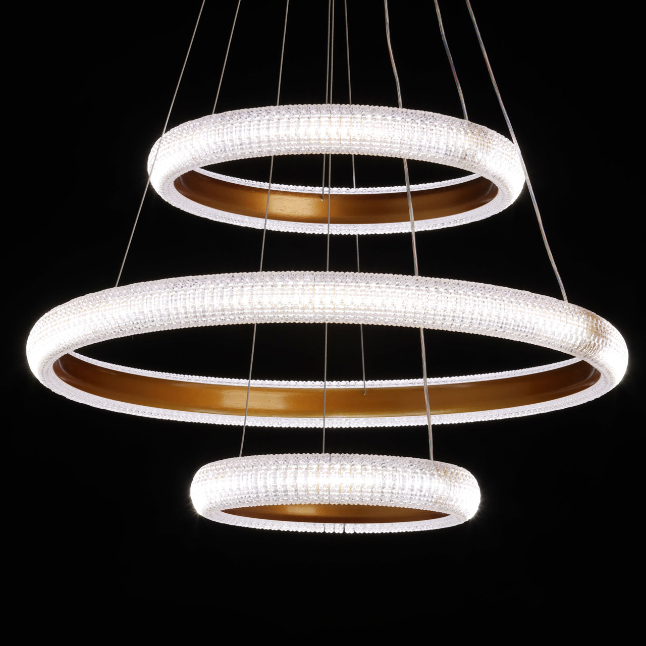 Металлическое основание светильника гальванизировано в цвет золота. Корпус плафона выполнен из сплава алюминия с цинком и обработан по технологии порошкового окрашивания в цвет матового золота. Светодиодные источники света закрыты прозрачным фактурным акрилом.