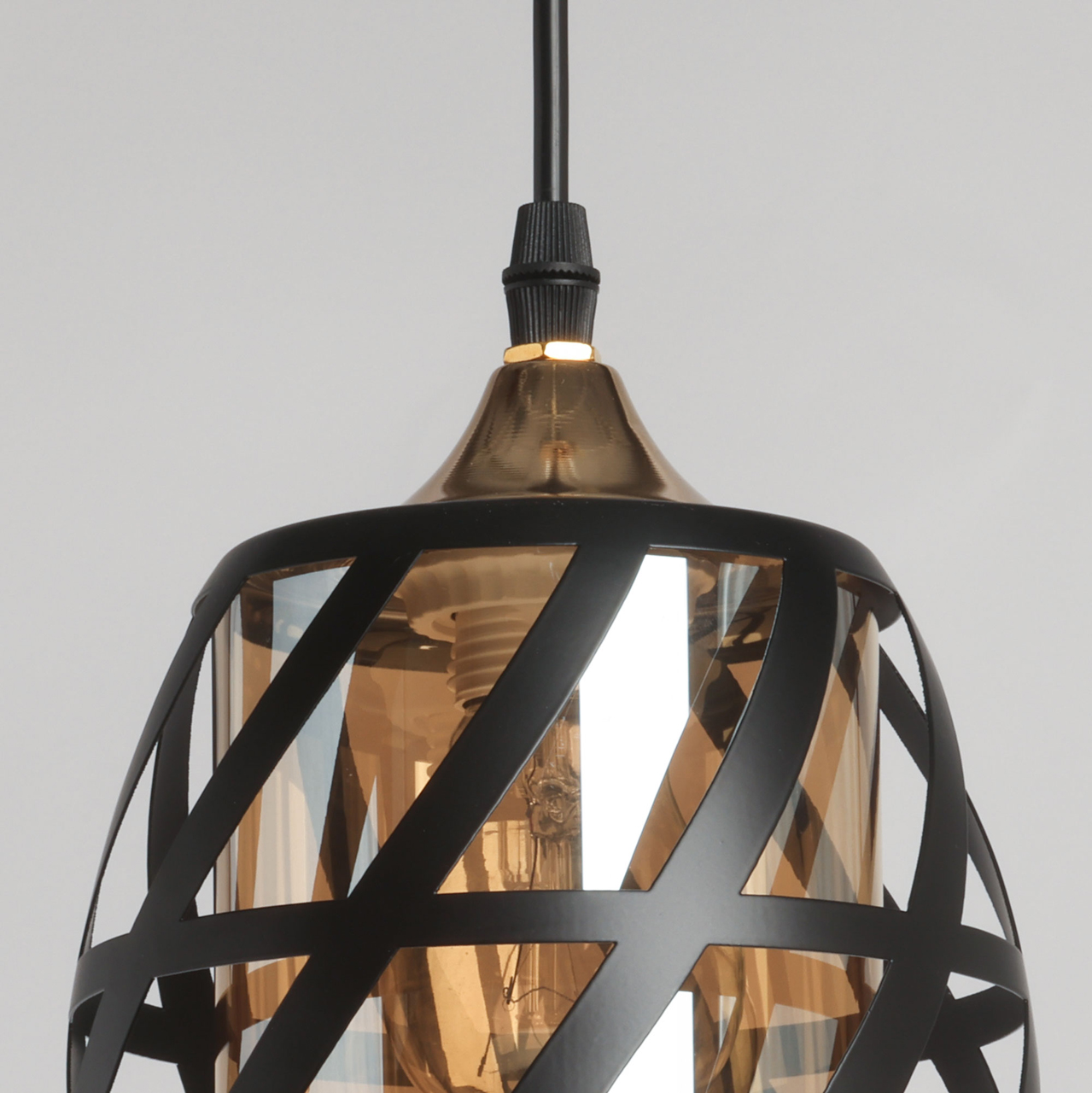 Потолочная чаша и держатель плафона выполнены из металла и гальванизированы в цвет золота. Металлический плфон окрашен в черный цвет. Внутренний стеклянный плафон гальванизирован в цвет шампань.