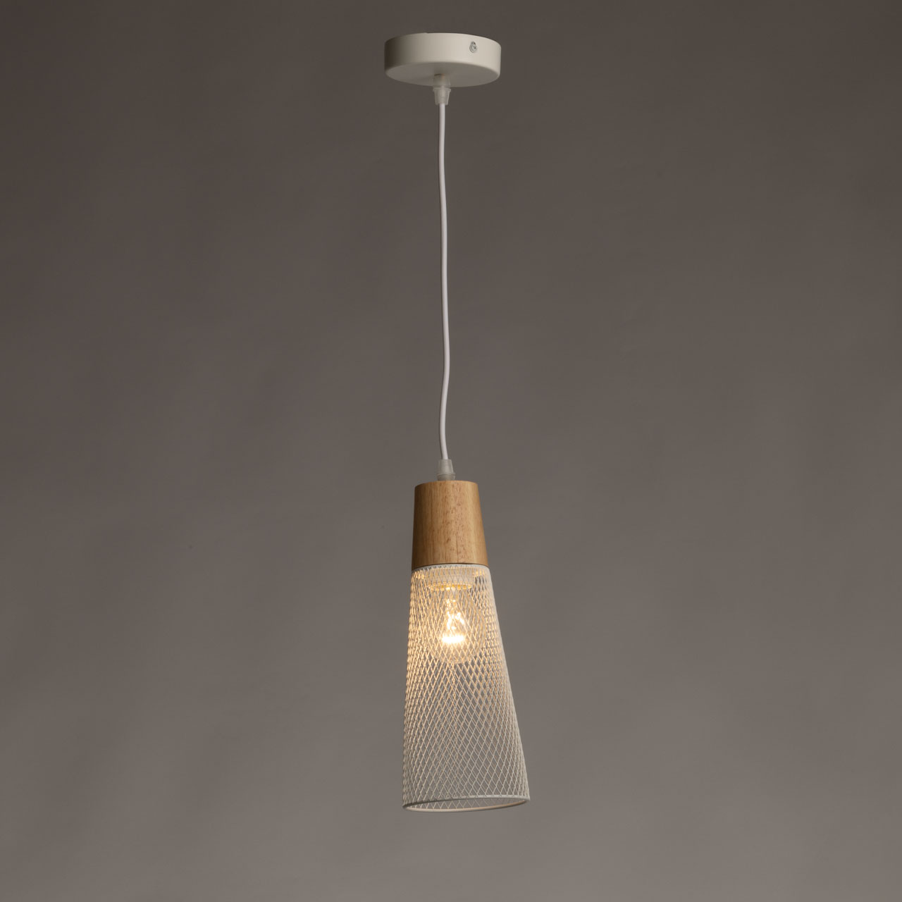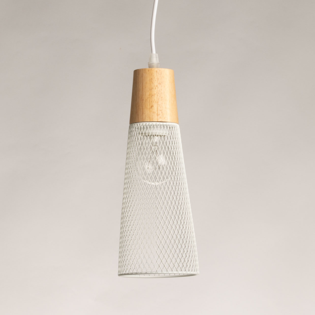 Металлическое основание и плафон подвесного светильника окрашены в белый цвет. Декоративный элемент на подвесе выполнен из металла с имитацией под натуральное дерево.