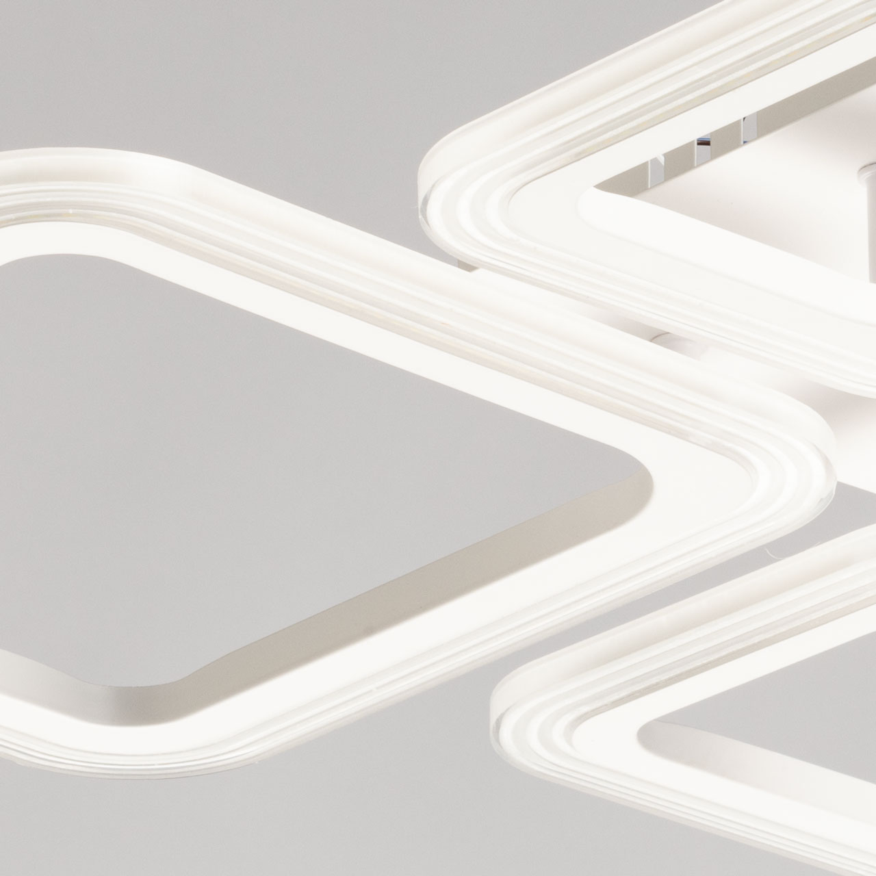 Металлическое основание потолочной люстры окрашено в белый цвет. Корпус плафона выполнен из сплава алюминия с цинком и окрашен в цвет основания. Светодиодный источник света закрыт полупрозрачным акрилом.