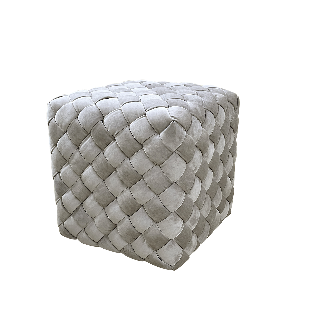 Необычный пуфик с интересной отделкой сиденья из плетеных лент ткани с наполнителем ППУ внутри в ромбическом узоре. Нейтральный серо-бежевый цвет велюра и компактность дают возможность вписать такой предмет мебели в разнообразные варианты интерьера.