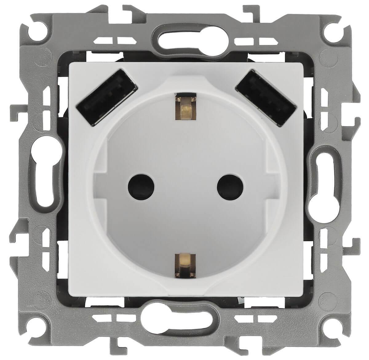 Купить "Розетка ЭРА Intro Solo Schuko P+E 16A 250V со шторками 2хUSB белый 12-4109-01 Б0047840"
