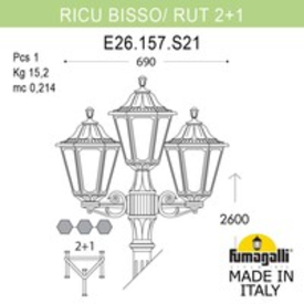 Садово-парковый фонарь FUMAGALLI серии RUT, модель RUT /RICU/BISSO 2+1. Парковый торшер, столб RICU с двумя уличными фонарями RUT на двух малых консолях BISSO и одним светильником на опоре. По форме напоминае "трезубец". Используются для архитектурного и ландшафтного освещения в стиле "классика". Место установки столбиков освещения - парковые дорожки, cкверы, садовые участки, тротуары, а так же ландшафтные и архитектурные объекты. Могут устанавливаться и внутри помещений в качестве декоративных уличных фонарей. Изготовлены в Италии, по уникальным технологиям "FUMAGALLI" из современного композитного полимера RESIN. Этот материал в 5 раз прочнее металла, не ржавеет, не окисляется, не выгорает на солнце, его не нужно красить. Все светильники пыле-влаго защищены по стандарту IP55 (Пылезащищенные, защита от водяных струй с любого направления). Рассеиватель выполнен из антивандального, не мутнеющего и не горючего PMMA (ПолиМетилМетаАкрилат). Срок службы светильника - не менее 20 лет. Температура использования от -60 до +90. В серии RUT есть фонари в настенном (BISSO/ RUT, OFIR/ RUT, MIRRA/ RUT, PORPORA/ RUT) подвесном (SICHEM/ RUT) и наземном исполнении (MINILOT/ RUT, MIZAR.R/ RUT, IAFAET.R/ RUT, ALOE.R/ RUT, ARTU/ RUT, GIGI/ RUT, RICU/ RUT, RICU/ISSO/ RUT 2L, NEBO/ RUT, NEBO OFIR/ RUT 2L, NEBO OFIR/ RUT 3L) со столбами разной высоты, с разным количеством и конфигурацией голов. Консоли настенных фонарей и кронштейны светильников на столбах освщения могут устанавливаться вверх/вниз. Столбы выше 150 см имеют в основе мощную стальную трубу с двойной оцинковкой. При заказе требуется выбрать цвет корпуса, цвет плафона и тип патрона. По стилю и дизайну серия уличных светильников RUT похожа на светильники малого размера серии ANNA и на светильники большого размера серии NOEMI.