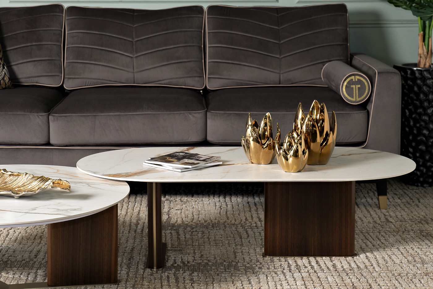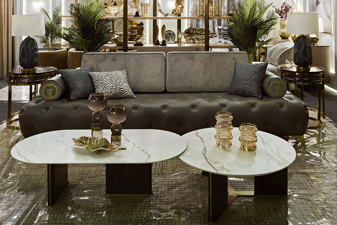 Овальный журнальный стол – стильная и лаконичная мебель, которая будет особенно гармонично смотреться в классическом интерьере или стиле арт-деко. Модель привлекает внимание своим современным дизайнерским решением. Журнальный стол с мраморным принтом, выполненный в изысканных белых тонах, заслуживает внимания и обязательно станет любимым элементом в вашем интерьере. Он может использоваться в качестве самостоятельного изделия, а также в тандеме с другим журнальным из этой коллекции. Элегантный овальный столик для гостиной или зоны отдыха, в котором сочетаются три стихии - камень, дерево и металл. Столешница изготовлена из прессованного при высокой температуре керамогранита, что обеспечивает высокую степень надежности и износостойкости. Опоры из древесной плиты высокого давления (HDF) с отделкой из шпона, с акцентом на золотое основание. Толщина столешницы - 12мм.