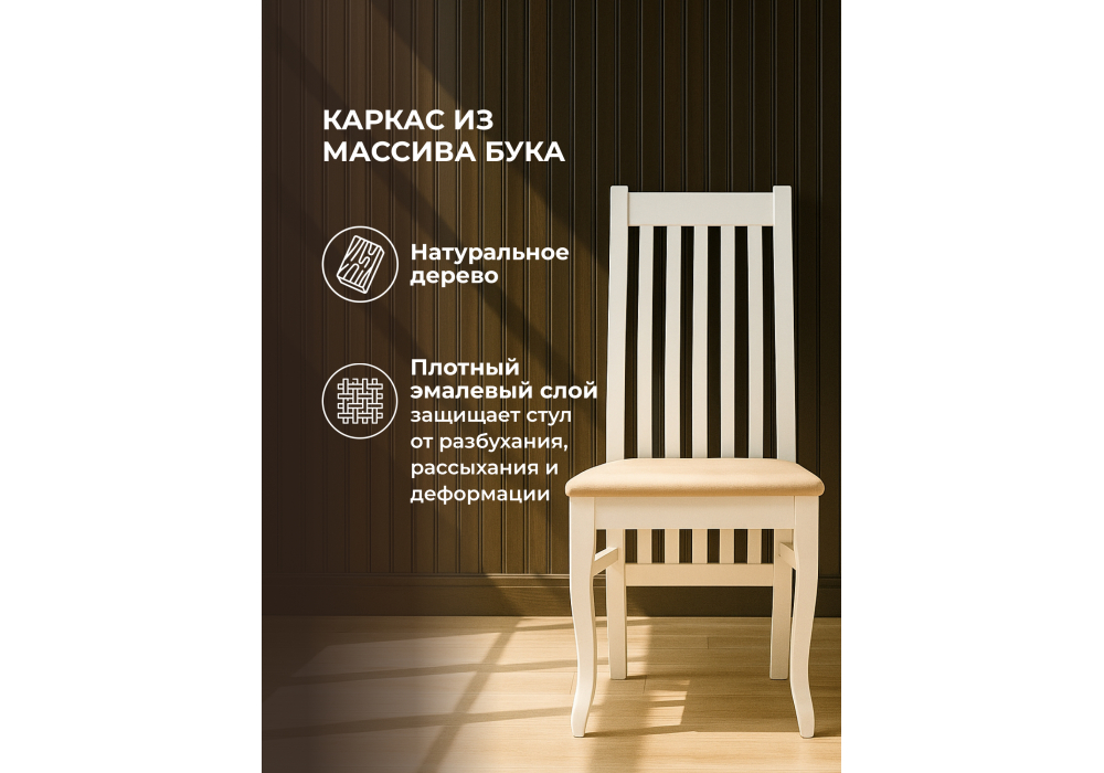 Материал каркаса - массив дерева; Материал сиденья - ткань; Материал обивки - ткань; Ширина - 45; Глубина - 55; Высота - 102; Ширина сиденья - 42; Глубина сиденья - 44; Высота сиденья - 46;