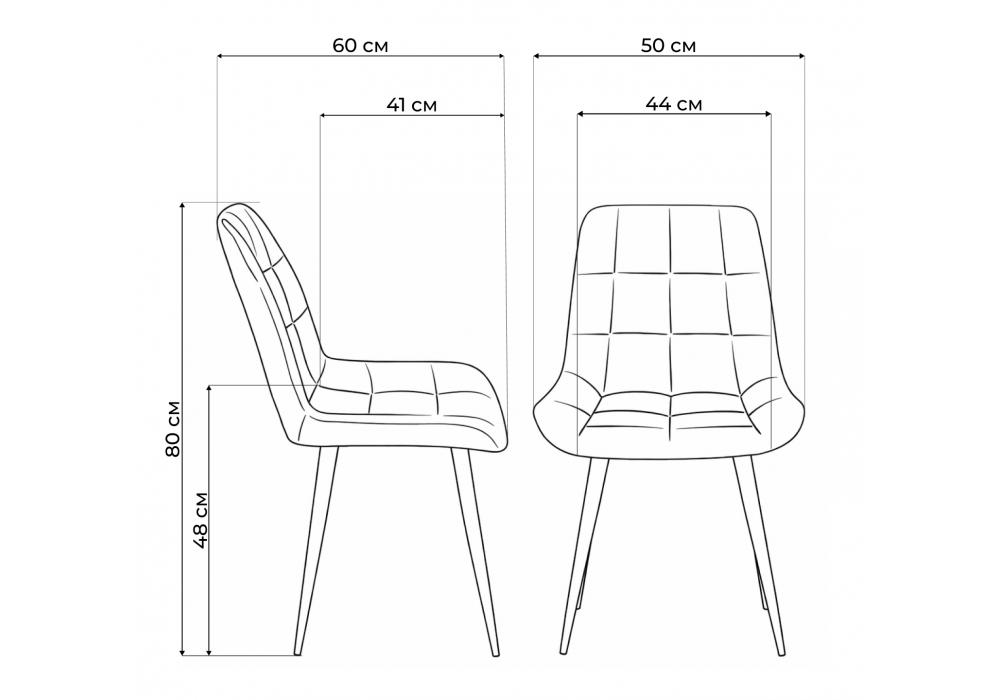 Материал каркаса - металл; Материал сиденья - велюр; Материал обивки - велюр; Цвет ножек - черный; Ширина - 50; Глубина - 60; Высота - 80; Ширина сиденья - 44; Глубина сиденья - 41; Высота сиденья - 48;