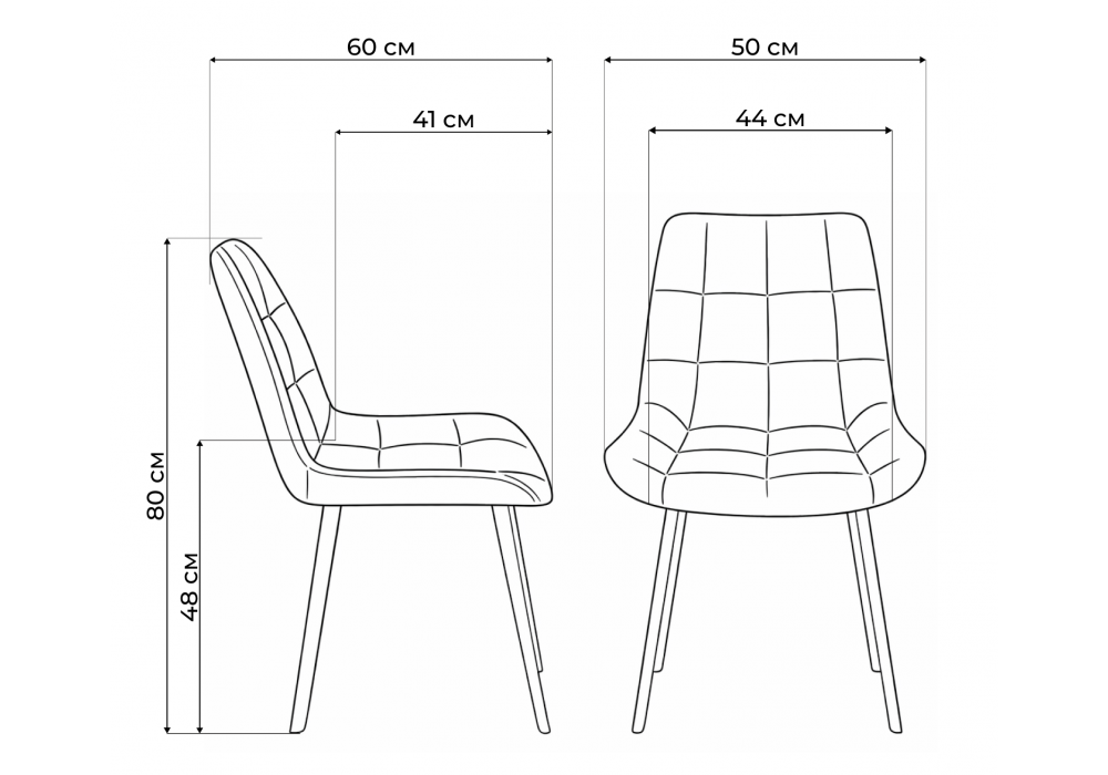 Материал каркаса - металл; Материал сиденья - велюр; Материал обивки - велюр; Цвет ножек - черный; Ширина - 50; Глубина - 60; Высота - 80; Ширина сиденья - 44; Глубина сиденья - 41; Высота сиденья - 48;
