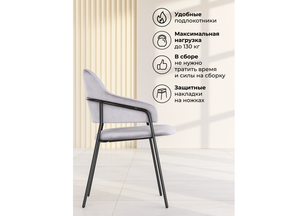 Высота подлокотников: 65 см. Материал каркаса - металл; Материал сиденья - велюр; Материал обивки - велюр; Ширина - 57; Глубина - 56; Высота - 82; Ширина сиденья - 48; Глубина сиденья - 47; Высота сиденья - 49;
